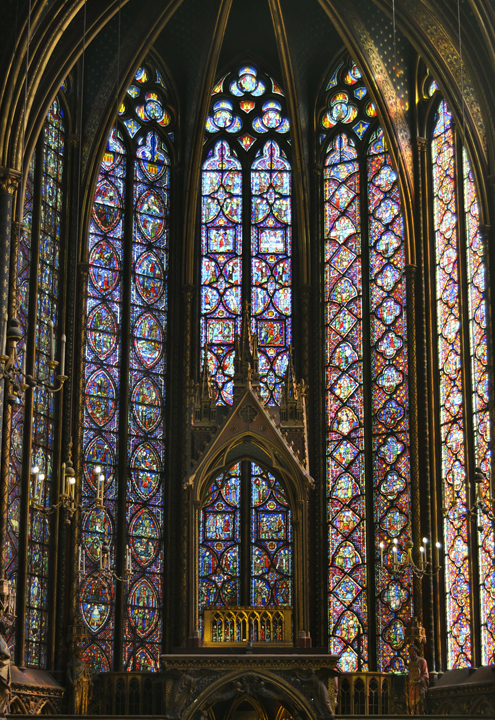 La Sainte-Chapelle (or The Holy Chapel) is a Gothic architectural feat of glass, light, and color. It was built by Louis IX, between 1242 and 1248, to house his Holy Relics, which included (supposedly) the Crown of Thorns (presently kept in the Notre-Dame Cathedral Treasury). The 15 panels of stained glass cover over 1,100 scenes from the Bible, leaving a lasting impression on the senses.